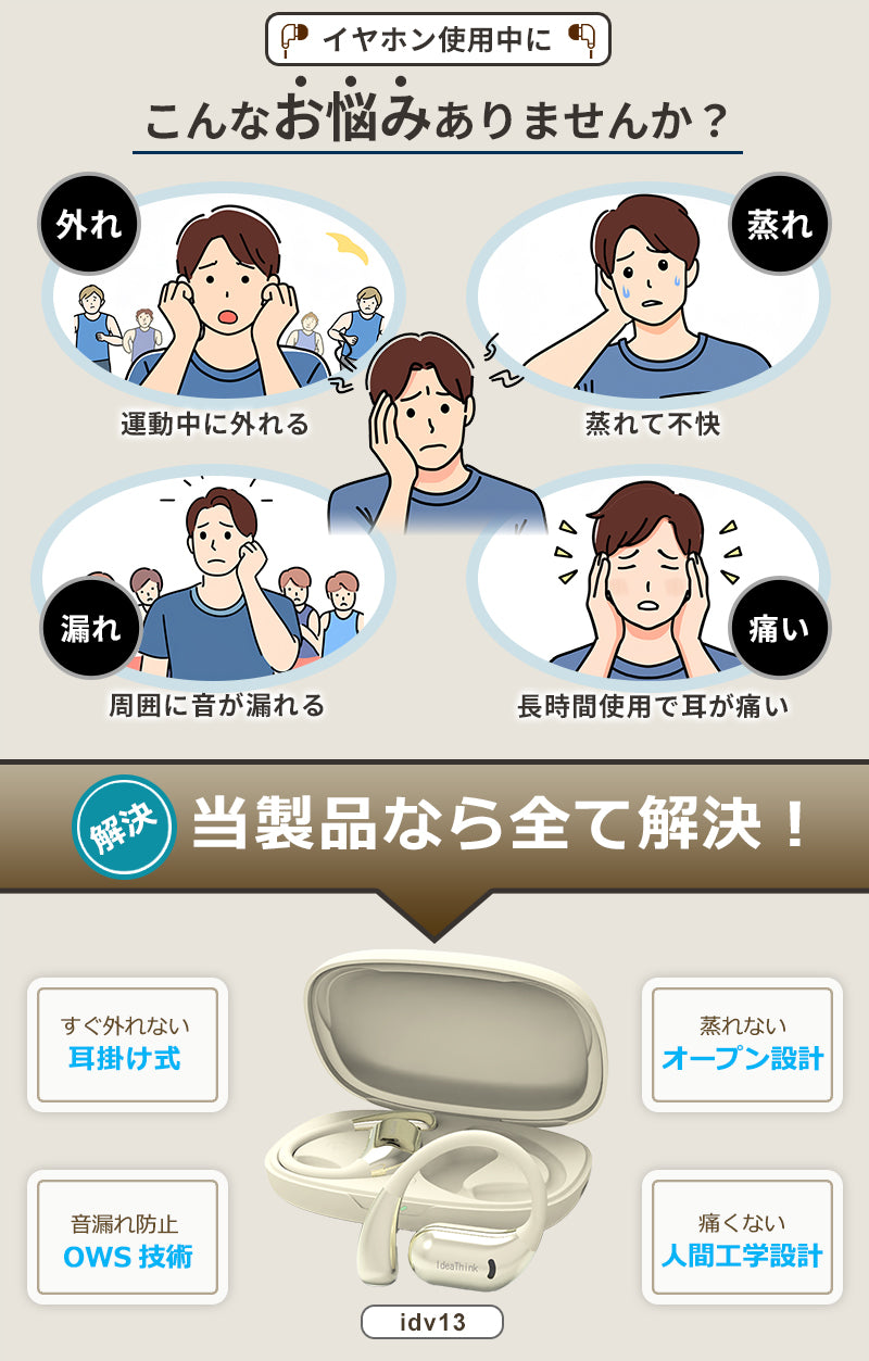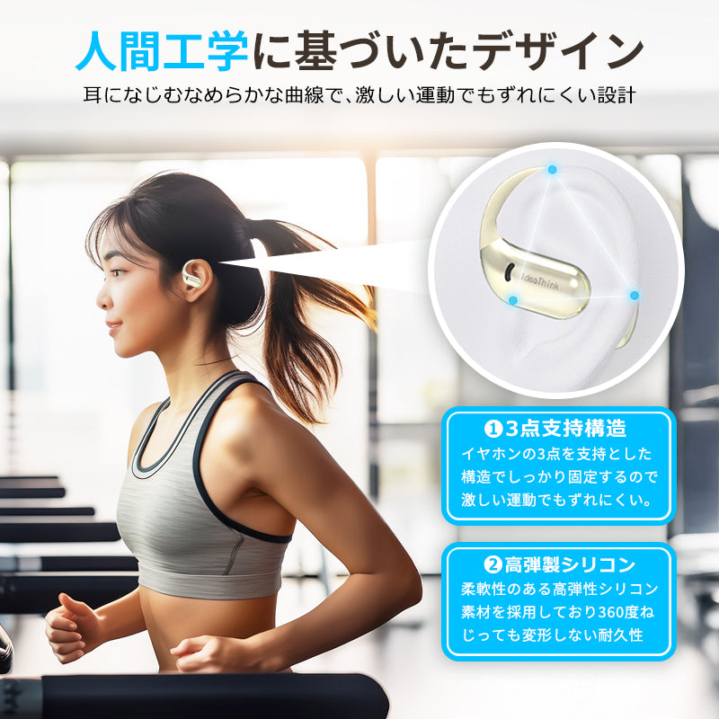 オープンイヤー設計を採用しており、耳が塞がれず、周囲の音が聞こえやすいので音楽を楽しみながらも周囲の音を感知できます。人間工学に基づいて設計された肌に優しいシリコン製イヤーフックは、わずか6.0gで羽根のように軽量で長時間着けても蒸れず痛みも無く、汗に強い防水仕様でスポーツにも最適です。