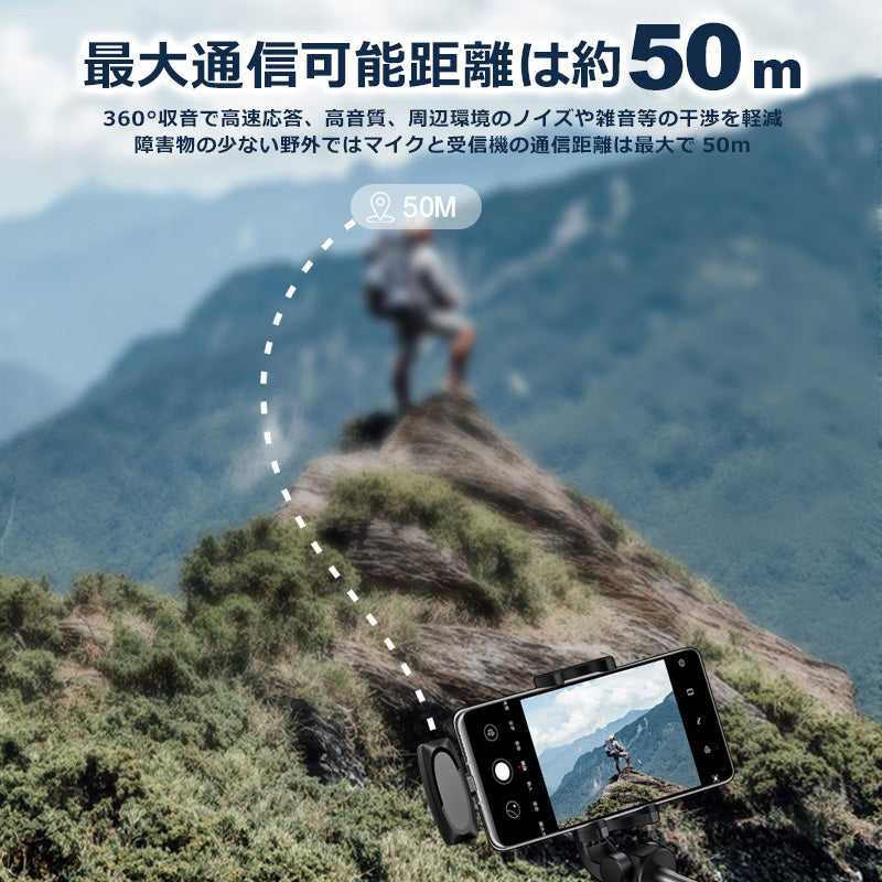 360°HDサラウンド収音で全方位から音を収音します。マイクと受信機は最大で約50m(干渉物が無い場合)離れても通信可能。