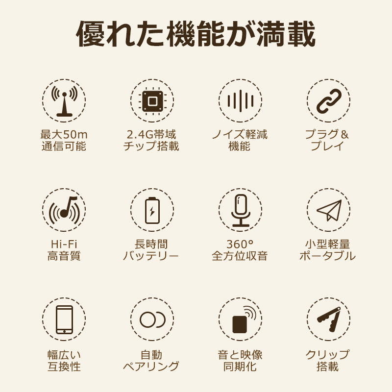 服やネクタイなど胸元に装着しやすいクリップで手に持つ必要がなく、ハンズフリーで使えます。 安定した信号、クリアな受信、高音質の音声を簡単に録音可能で動画配信、インタビュー、eコマースに最適な小型ピンマイクセット