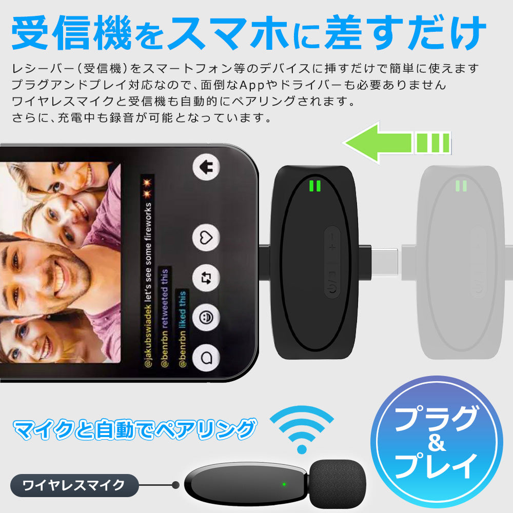 ワイヤレスマイク ピンマイク ラべリアマイク 2人同時 2個セット type-c lightning 3.5mm 無線マイク ライブ配信 動画配信 インタビュー 会議 youtuber tiktok 録音 ノイズキャンセリング 低遅延 高音質 スマホ iphone android ipad 小型 軽量 動画 ハンズフリー