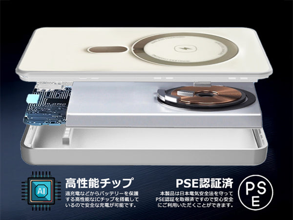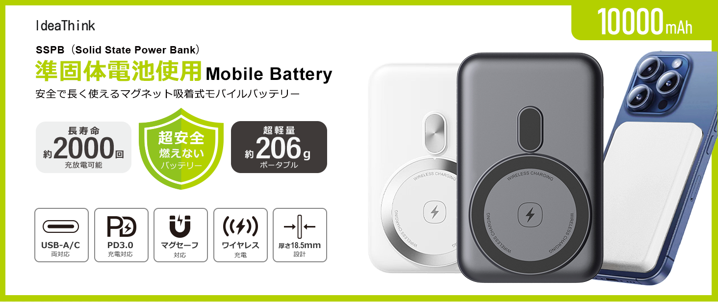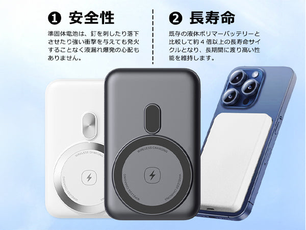 | 商品特徴 | ■超安全な次世代準固体電池採用 新開発の準固体電解質を採用した画期的なモバイルバッテリー。激しい発火や爆発の心配が無く、 驚異の安全性と効率的なエネルギー密度を両立した、従来のバッテリーの概念を覆す次世代のモバイルバッテリーです。 ■驚異の安全性 準固体電池は落下させたり、釘を刺したり、強い衝撃を与えても発火することなく、液漏れや爆発の心配もありません。 ■従来バッテリーの4倍の長寿命 準固体電池の採用により、約2000回の充放電サイクルを実現。従来の液体ポリマーバッテリーと比較して、約4倍以上。リン酸鉄バッテリーと比較し約4倍の長寿命サイクルとなり、長い期間高い性能を維持します。また、固体電解質を採用することで、リチウムデンドライトの発生を抑えてバッテリーの寿命を延ばすと同時に安全性を向上させました。 ■多重保護システム 高品質なチップや部品と過充電・過放電・ショートなどの多重保護回路を搭載することで、より安全に使用できる環境を実現。 ■ワイヤレスMagSafe充電 マグセーフ対応でスマートフォンにマグネット磁力吸着し、ケーブルを差すことなくワイヤレスでより効率的で高速な充電が可能です。 ■3台まで同時充電可能 USB Type-AとType-Cの両ポートを搭載しているので、iPhoneやandroidスマホ、iPad等のタブレット(有線)を3台まで同時に急速充電できます。 ■PD急速充電対応 ワイヤレス無線充電の他に、付属USBケーブルを使用した有線によるPD充電にも対応。お急ぎの時にはスマートフォンを急速充電することができます。 ■一目で残量がわかる 充電状況やバッテリー残量が確認できるインジケーター搭載。ランプの点灯状態や色で急速充電や出入力状態が一目で簡単確認可能です。 ■小型軽量で飛行機内持ち込み可能 指で持てるほどの小型軽量サイズでポケットに入れて外出先に持ち出し可能。国内外の飛行機に持ち込み可能で、長時間のフライトにも便利です。(詳しくはご利用の航空会社にご確認下さい。) ■PSE認証済 本製品は日本電気安全法を守りPSE認証を取得済ですので、安心安全にご利用いただくことができます。 |