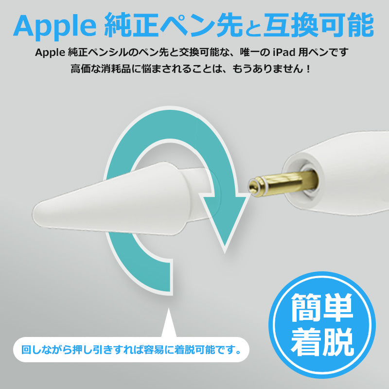 ペン先は簡単に着脱が可能なデザインになっています。また、本製品はApple純正ペンシルのペン先と交換可能な、唯一のiPad用ペンです。高品質低コストなので、高価な消耗品に悩まされることはもうありません。