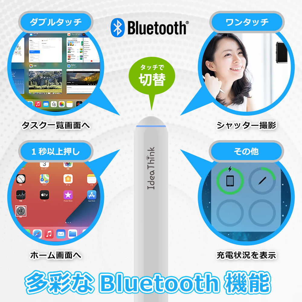 ダブルタッチでタスク画面へ。ワンタッチでシャッター撮影。1秒以上押すとホーム画面へ。その他、充電状況を表示など、多彩なブルートゥース機能をタッチで切替可能です。