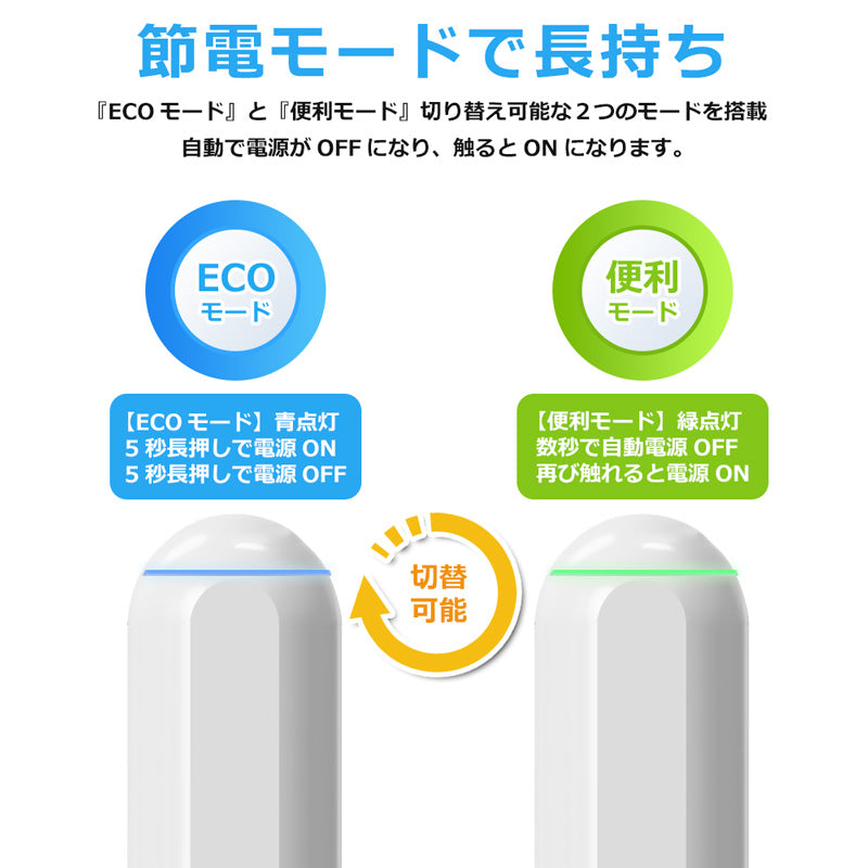 『ecoモード』と『便利モード』の2つのモードをタップ操作で切り替えられます。『便利モード』はアップルペンシル2のように放置して数秒経つと、自動電源OFFになります。